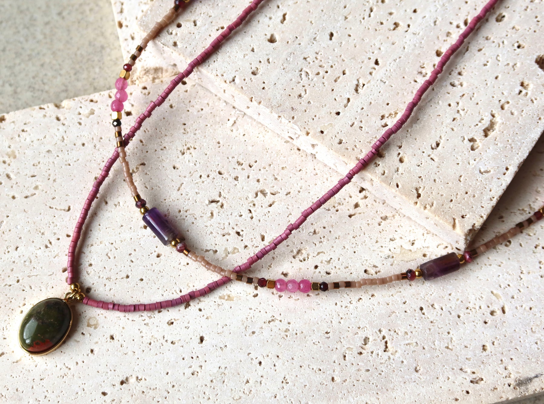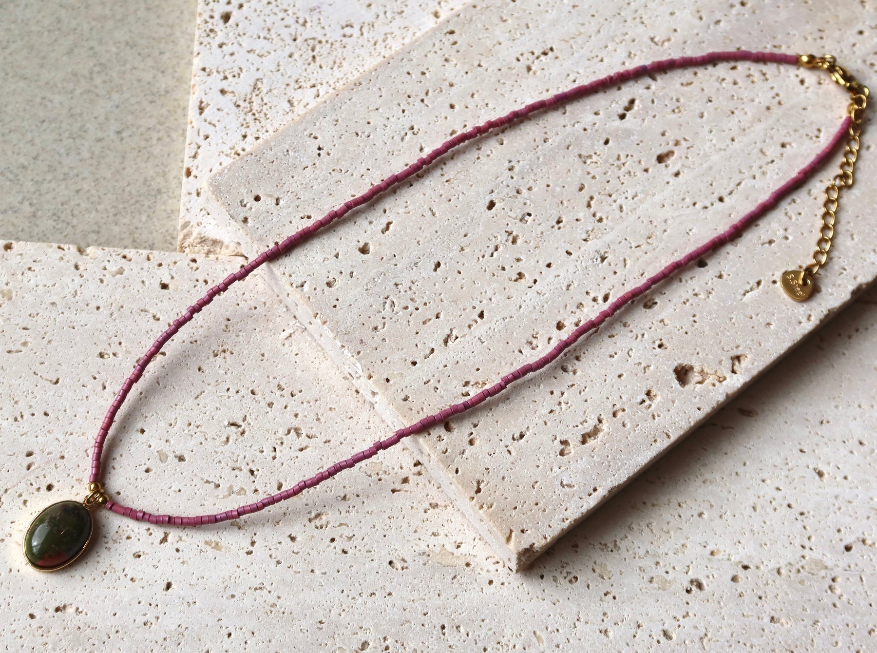 Necklace with a green pendant on purple natural stone