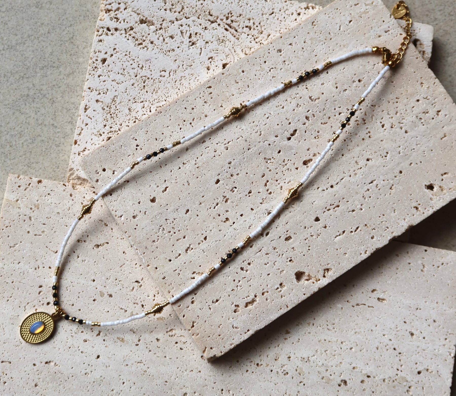 Plated in luminous 18k gold, this necklace is perfect for layering or wearing as a subtle statement on its own. Its neutral palette makes it a versatile accessory that complements any outfit—from casual daytime looks to evening wear.